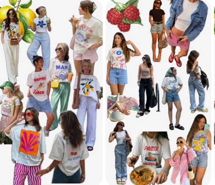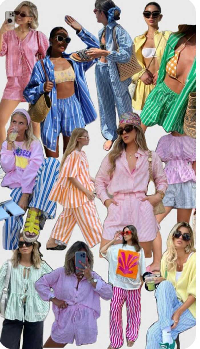 E tem uma tendencia de estampa que não é novidade, mas muito peculiar que é inspirado no verão italiano que são estampas de comida e bebida: massas, vinho, frutas, drinks, frutos do mar, também estampas com referências a praia, sol e mar, enfatizando a “vibe’ do verão bem quente, acessórios de conchas, estrela, pérolas tudo relacionado ao mar estão dentro desta tendência.