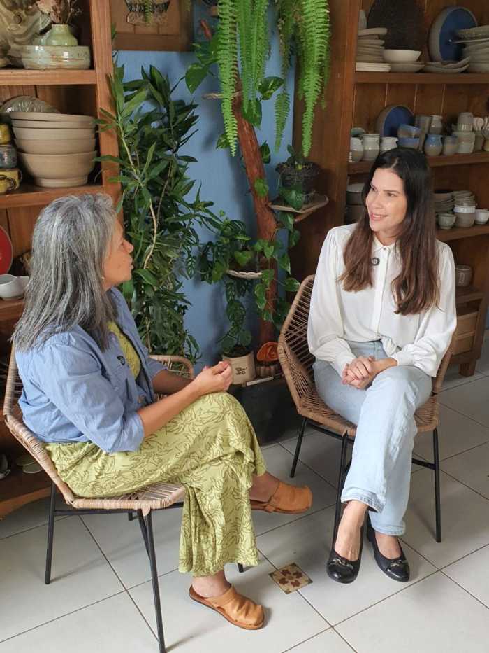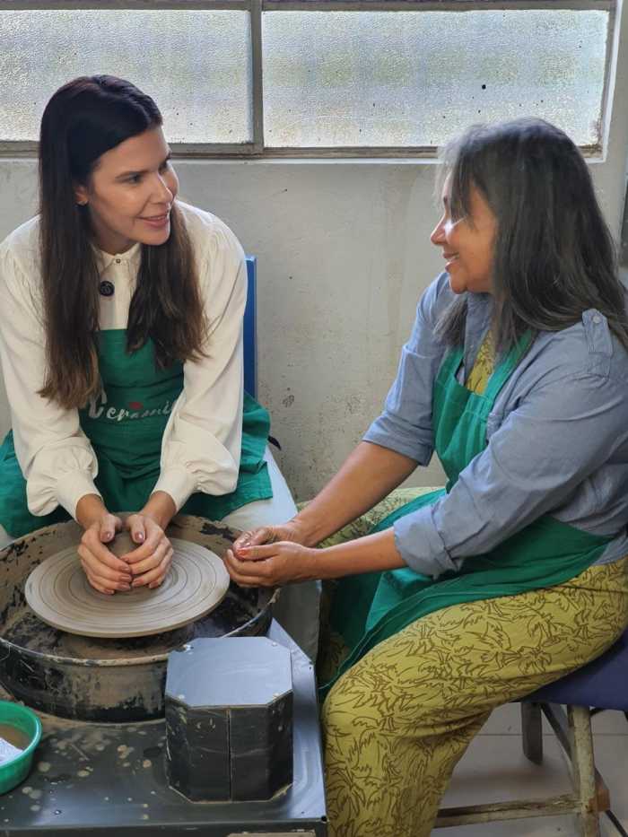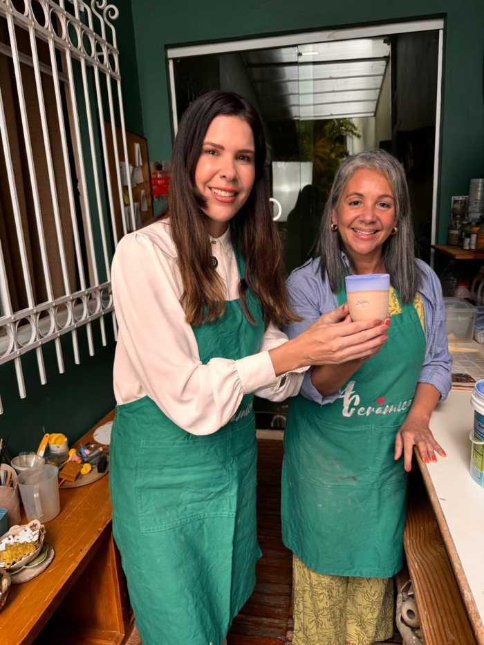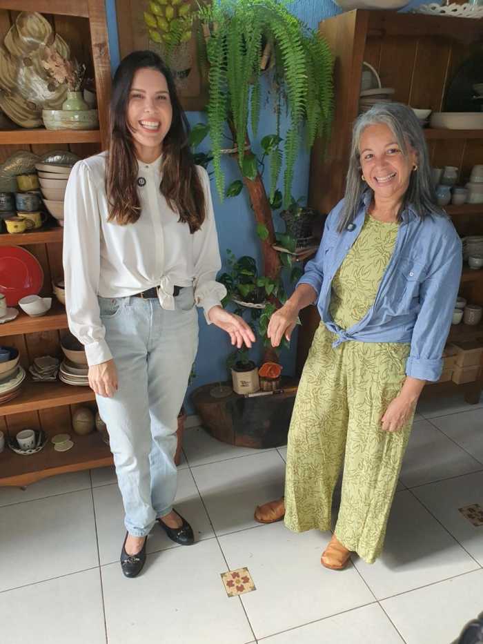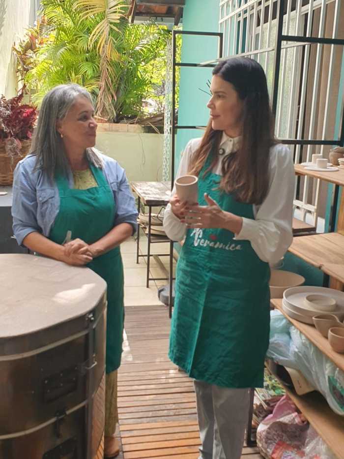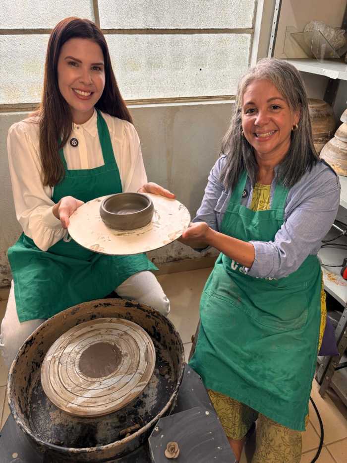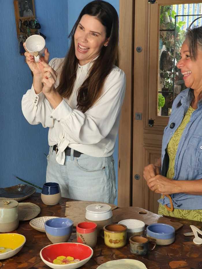 E, claro, teve um momento especial e descontraído: eu, como apresentadora, literalmente coloquei a mão na massa. Vivi a experiência de criar minha primeira peça de cerâmica, acompanhando todo o processo do barro ao acabamento, até chegar à peça final pronta para venda. Um exercício de presença, paciência e conexão com o fazer manual.