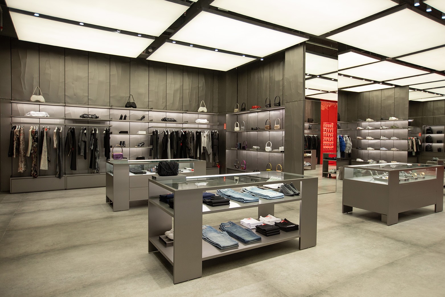 Tudo começa na fachada única, feita de concreto pré-moldado, que destaca a afinidade da marca com a estética industrial e a inovação arquitetônica. Depois, o cliente adentra um um espaço de 313 metros quadrados e descobre uma seleção que engloba as coleções femininas e masculinas de primavera-verão 2025 e os acessórios – pense em óculos de sol, relógios, bolsas, pulseiras e anéis. Há ainda o The Red Room, espaço voltado ao denim, expertise máxima da grife. “O denim não é só um par de calças jeans. Hoje ele está em vestidos, sapatos, saias, bonés, tudo feito com esse tecido lindo e fantástico", conta Renzo. Trata-se de um espaço monocromático revestido com o icônico vermelho laqueado da marca que oferece uma jornada imersiva no coração da grife.