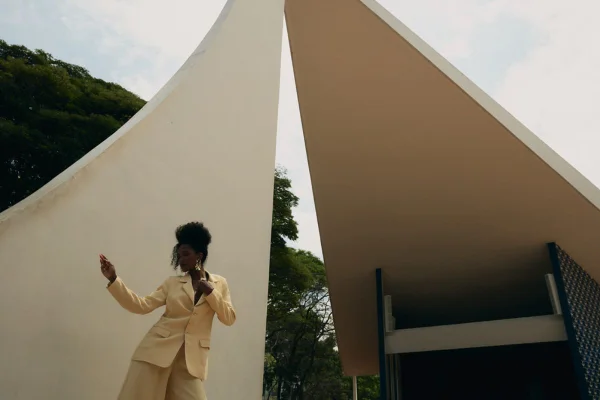 Imagem colorida de modelo posandoGabriella Santana no Museu Nacional
