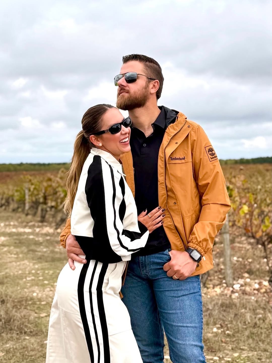 Os dois aparecem caminhando de mãos dadas em meio a um vinhedo. Natália elegeu um look moderno e esportivo, composto por um conjunto off-white com faixas pretas laterais, sendo um casaco curto e uma saia. Nos pés, botas pretas complementam o visual. Já Zé Neto usou uma jaqueta caramelo, camisa polo preta por baixo, calça jeans e botas marrons, combinando com o cenário.