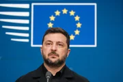 O presidente ucraniano Volodymyr Zelensky fala com a imprensa antes da cúpula da União Europeia, na Bélgica