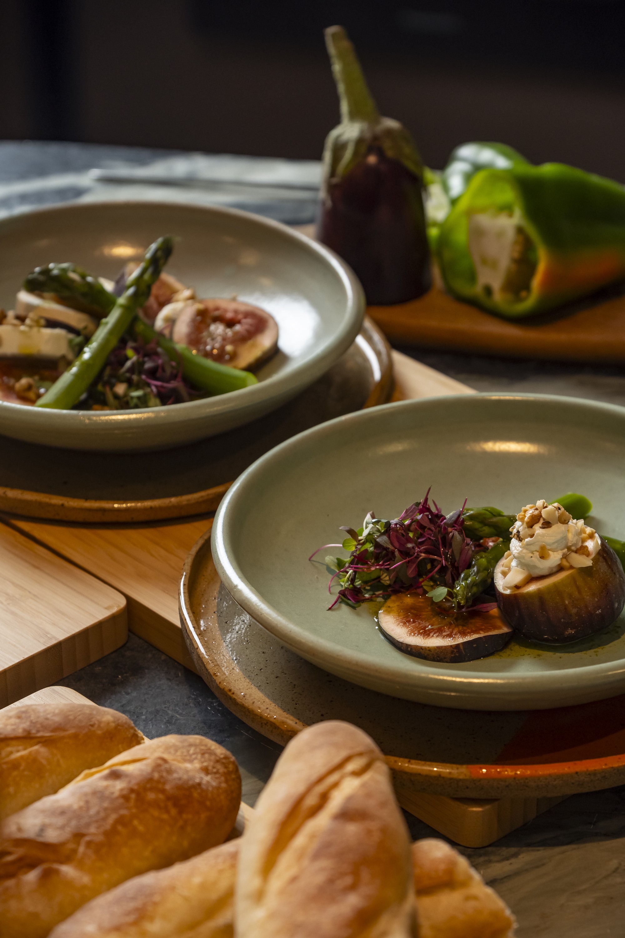 Carpaccio de figos com queijo de cabra, aspargos e gergelim