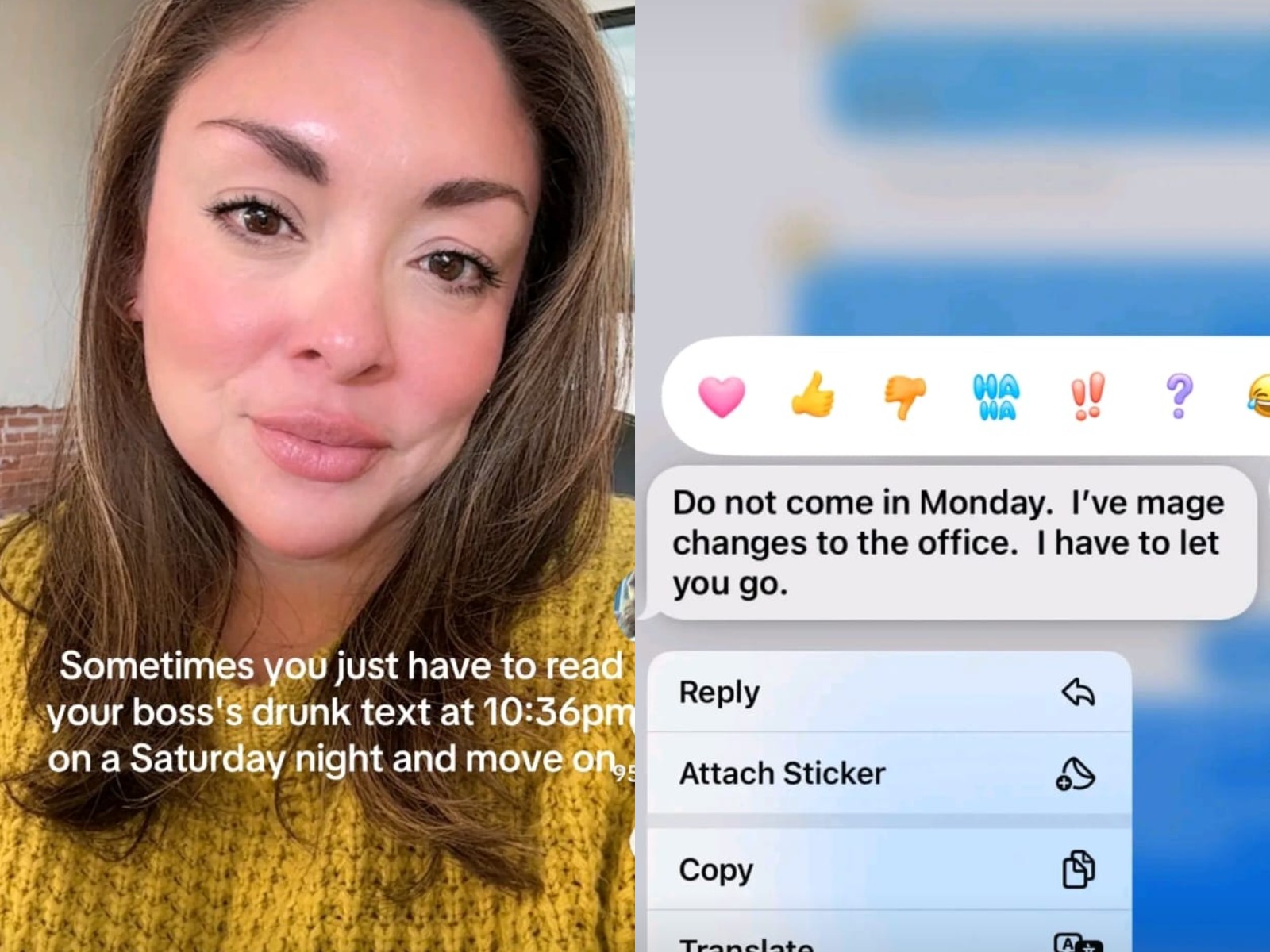 “Não venha na segunda. Fiz mudanças no escritório. Eu tenho que te dispensar.”, escreveu a chefe de McCarley. Horas depois, à 1h07 do domingo, ele enviou outra mensagem, desta vez com a captura de tela de uma foto dela ao lado de uma amiga nas redes sociais — algo que, segundo McCarley, tornou toda a situação ainda mais estranha.